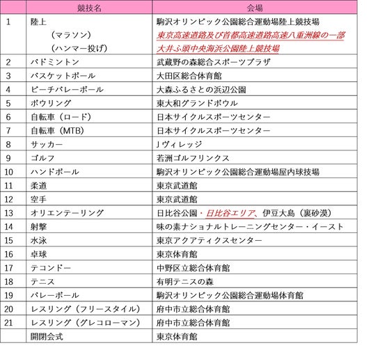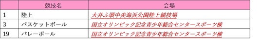 その他の競技会場及び練習会場については以下のとおりです。赤字(下線・斜体)部分が