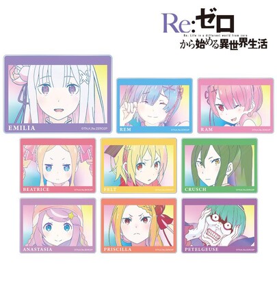 エミリア、レム、ラム、ベアトリス、フェルト、クルシュ、アナスタシア、プリシラ、ペテルギウスを新たなタッチで魅力的に表現し、アクリルカードに仕上げました。