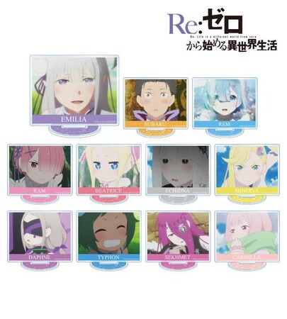 エミリア、スバル、レム、ラム、ベアトリス、エキドナ、ミネルヴァ、ダフネ、テュフォン、セクメト、カーミラの印象的なシーンをアクリルスタンドに仕上げました。