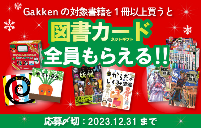 株式会社 学研ホールディングス(東京・品川/代表取締役社長:宮原博昭)のグループ会社、株式会社 Gakken(東京・品川/代表取締役社長:五郎丸徹)は、2023年11月29日(水)より、対象書籍を買うと図書カードネットギフトが必ずもらえる『クリスマスプレゼントキャンペーン』を開始いたしました。