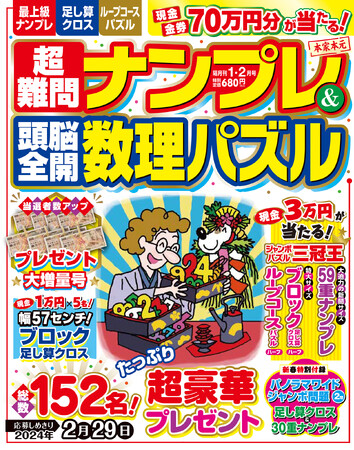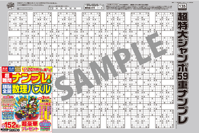 新聞サイズのド迫力で、毎号大人気の本誌オリジナル超特大ジャンボパズル。今号は「超特大59重ナンプレ」に「超特大ブロック足し算クロス・ハーフ」「超特大ループコースパズル・ハーフ」と、いつも以上に手ごわい3種の難問が登場。