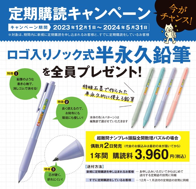 ただいま、学研受注センターで『超難問ナンプレ&頭脳全開数理パズル』の新規定期購読を申し込まれた方と、すでに定期購読をされている方全員に、本誌のロゴ入り「ノック式半永久鉛筆」をプレゼントするおトクなキャンペーンを実施中です。