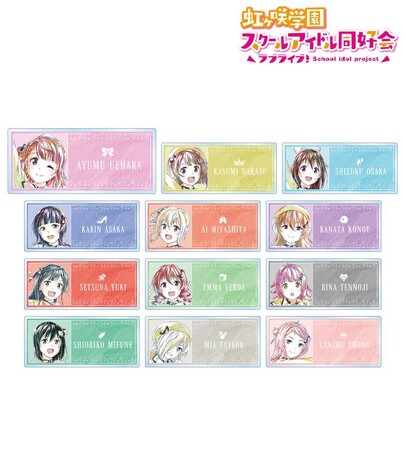上原 歩夢、中須 かすみ、桜坂 しずく、朝香 果林、宮下 愛、近江 彼方、優木 せつ菜、エマ・ヴェルデ、天王寺 璃奈、三船 栞子、ミア・テイラー、鐘 嵐珠を新たなタッチで魅力的に表現し、アクリルネームプレートに仕上げました。