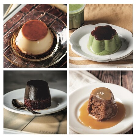 (左上から時計回りに)ミルキープリン/みんなが好きな、ベーシックなおいしさのカスタードプリン。卵液にスキムミルクを入れることで、ミルク感が増し増しに!つるんとした口当たりには思わずうっとり。 プチッとプリン(抹茶)/プッチン棒付きの容器で固めて、プチッと棒を折って取り出すまでが楽しい懐かし系プリン。ホームメードだから、基本のフレーバーに加えて抹茶味も紹介しています。 スティッキートフィープディング/デーツをふんだんに使った生地に、トフィーソースをたっぷりとかけて食べるイギリスの伝統菓子。立ちのぼるシナモンなどのスパイスの香りも楽しみたいから、焼き立てをどうぞ! チョコプリンケーキ/ブラックココアとクリームチーズを使った濃厚なチョコプリンに、ココア風味のスポンジ生地を重ねました。チョコプリンは、ベルベットのような優美でなめらかな口当たりです。