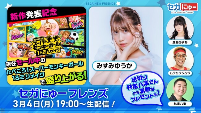 第7回は、シリーズ最新作『スーパーモンキーボール バナナランブル』の発表を記念して、ゲストにタレントのみすみゆうかさん、紙切りの林家八楽さんを迎え、セガにゅーファミリーと一緒に『たべごろ!スーパーモンキーボール 1&2リメイク』をたっぷりとプレイします!