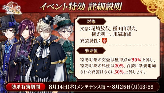 期間中「尾崎放哉」「種田山頭火」「横光利一」「川端康成」の衣装を編成して潜書すると、得点の獲得数がそれぞれ50%上昇します。また、「火」の衣装を編成して潜書すると、得点の獲得数がそれぞれ20%上昇します。