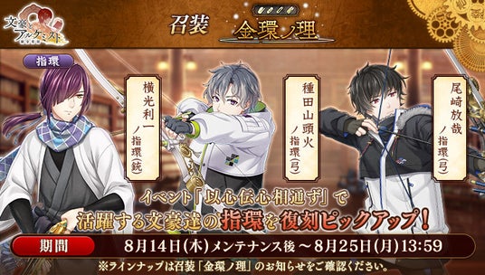 召装『金環ノ理』のラインナップを更新いたしました。この召装では、イベント『調査任務「以心伝心相通ず」』で活躍する「尾崎放哉」「種田山頭火」「横光利一」の指環を一定の確率で入手できます。
