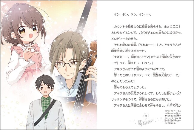 動画「女子高生エフェクターを買いに行く!」や小説「作曲少女」シリーズの挿絵などを手がけたイラストレーター・まつだひかりさんが絵を担当。花美、クララら子どもたちのかわいらしいやりとりはもちろん、イケメンすぎる花美パパの演奏シーンにも注目です!