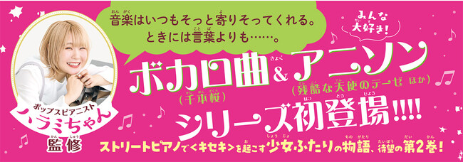 作中では、実在する名曲を花美たちが演奏。登場曲は、ポップスピアニストとして活動するハラミちゃんが監修しています。第2巻『千本桜に願いをこめて』では、ボカロ曲の「千本桜」、アニソンの「残酷な天使のテーゼ」、J-POPの「小さな恋のうた」「ベテルギウス」などが登場します。花美だけでなく、イケメンの花美パパも演奏するので、お楽しみに。