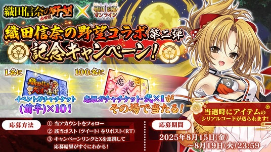1名の方にコラボイベントで利用可能な「ガチャチケット」、100名の方に「恋姫ガチャチケット・弐」をプレゼントいたします。