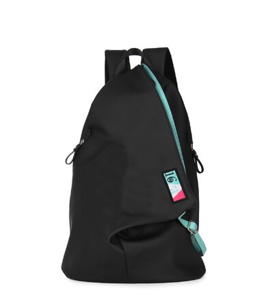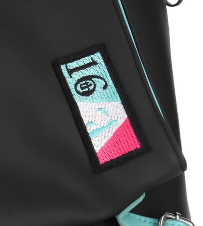 初音ミクのシルエットと16周年の文字をデザインした刺繍タグを取り付けており、ベルトや開口部のファスナー部分には差し色として初音ミクのイメージカラーを使用しております。