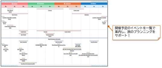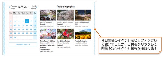 - 桜やお祭り等の季節ごとの見どころ、東京で開催される国際的なイベント等の年間スケジュールをチェックできるイベントカレンダーを新たに搭載