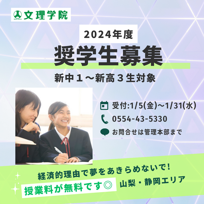 株式会社 学研ホールディングス(東京・品川/代表取締役社長:宮原博昭)のグループ会社、株式会社文理学院(山梨・都留/代表取締役社長:小倉勤)は、2024年度奨学生を募集します。募集期間は、2024年1月5日(金)~31日(水)です。奨学生は期間内の授業料が無料となります。