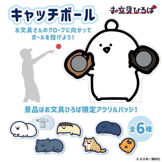 お文具さんが持つグローブにカラーボールを投げる〈キャッチボール〉は、グローブにボールが入った数に応じて、もらえる限定アクリルバッジの数が変わります。キャッチボールの距離感は近すぎ…ではないかもしれません。