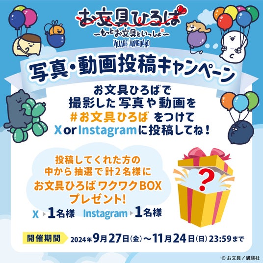 お文具ひろばで撮影した写真や動画を#お文具ひろば をつけてXまたはInstagramに投稿してくださった方の中から抽選で合計2名の方に〈お文具ひろばワクワクBOX〉が当たります。