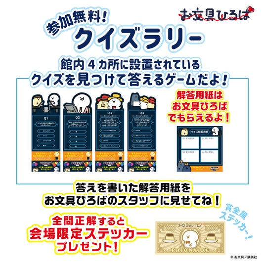 〈クイズラリー〉は、館内に設置されているプリオネア風のクイズパネルを4ヶ所見つけ出し、クイズに答えて全問正解すると、お文具ひろば限定の賞金風ステッカーが1枚もらえます。参加無料なので、ぜひチャレンジしてみてください。