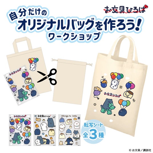 自分だけの〈オリジナルバッグを作ろう!〉は、ご購入いただいたトートバッグor巾着バックに、転写シートをアイロンで貼り付けて、その場でこの世にひとつだけのお文具さんグッズを作ることができます。