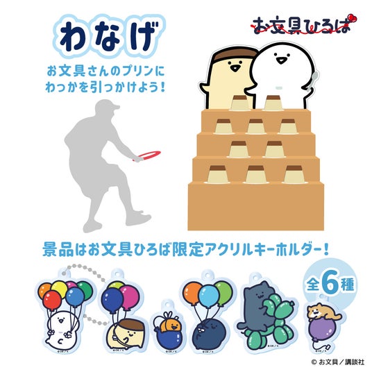 お文具さんの好物であるプリンにわっかを投げる〈わなげ〉は、ひっかけられたわっかの数に応じてもらえる限定アクリルキーホルダーの数が変わります。