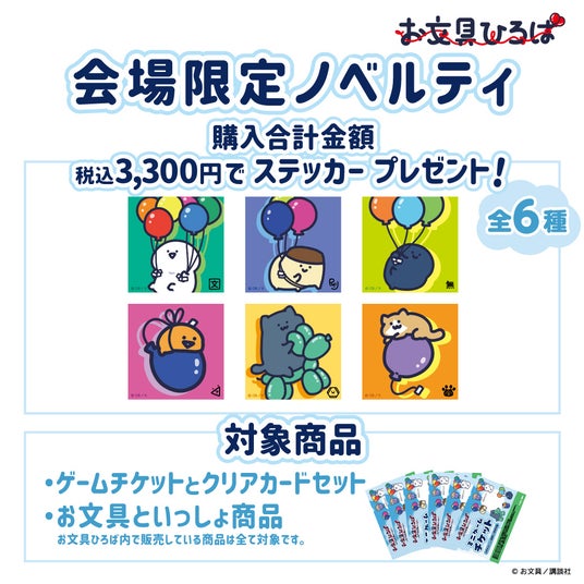 ゲームチケットとクリアカードセットを含むお文具ひろば販売商品を3,300円(税込)以上お買い上げいただくと、お文具ひろば限定ステッカー(全6種)を1枚プレゼントいたします。