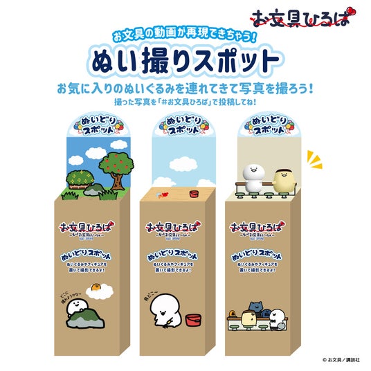 〈ぬい撮りスポット〉はかくれんぼがしたくなる公園風のスポット、毎年潮干狩りを楽しんでいるクリームソーダ海浜公園風のスポット、そして猫さんの働いている喫茶店風のスポットをご用意しております。ご持参いただいたぬいぐるみやその場で出会ったぬいぐるみと一緒に、ぜひたくさん写真を撮って#お文具ひろば でシェアしてください。
