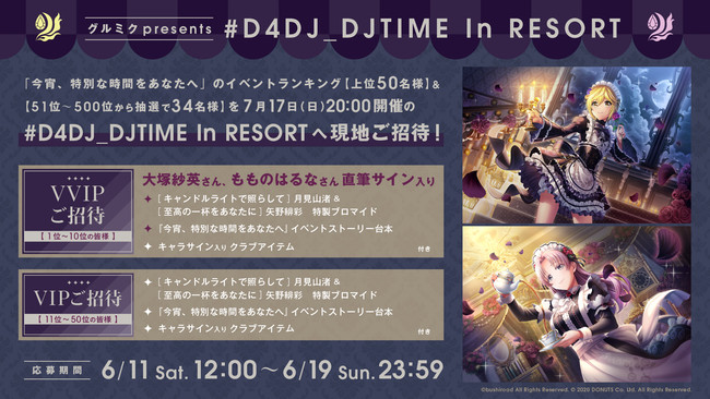イベントランキング上位50名様と51~500位から抽選で34名様を「グルミクpresents #D4DJ_DJTIME In RESORT」にご招待!