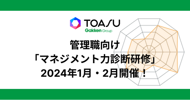 株式会社 学研ホールディングス(東京・品川/代表取締役社長:宮原博昭)のグループ会社、株式会社TOASU(東京・品川/代表取締役社長:宮田 晃)は、2024年1月25日(木)~26日(金)と2024年2月8日(木)~9日(金)に「マネジメント力診断研修 ~上級幹部候補~(他社合同形式)」を実施致します。