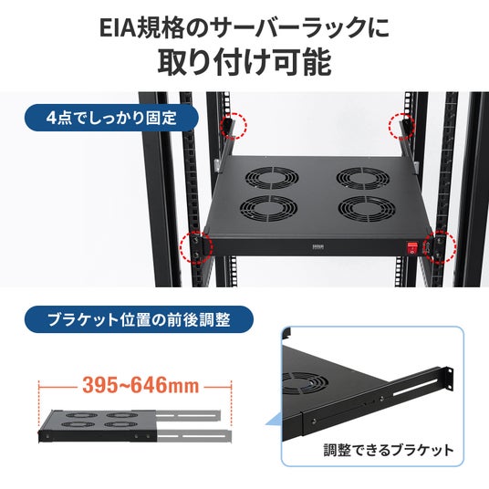 高性能ファンを搭載し、強力な風量でラック内の熱を効率よく排出。夏場や高負荷時でも機器を守ることができます。必要に応じて複数台を設置することも可能です。