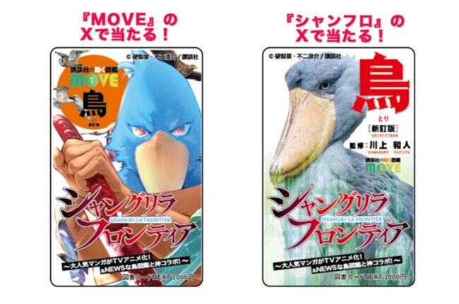 MOVE編集部公式Xとシャングリラ・フロンティア公式Xで、それぞれの表紙が入れ替わった限定デザインの図書カード1000円分を、抽選で各10名さまにプレゼント。ここでしか手に入らない、漫画の主人公になってしまったハシビロコウと、実写版シャンフロの図書カードをぜひゲットしてください!