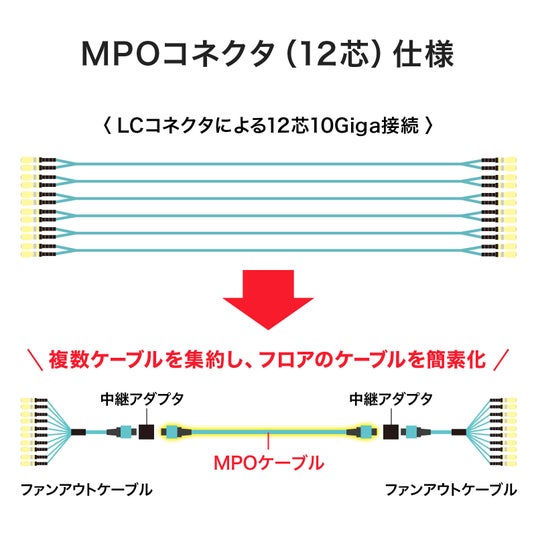 1本のケーブルで12芯を一括接続でき、省スペース化・施工時間の短縮を実現します。