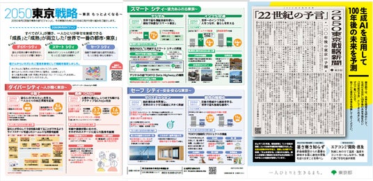 すべての「人」が輝き、一人ひとりが幸せを実感できる「成長」と「成熟」が両立した「世界で一番の都市・東京」。2050年代に目指す東京の姿であるこの「ビジョン」と、その実現のために2035年に向けた取り組みを、一部抜粋してご紹介しています。また、未来を展望する試みとして、生成AIを活用し100年後の未来を予測した「22世紀の予言」も掲載しています。