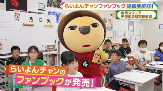 らいよんチャンの20年の歴史をまとめた「年表」、らいよんチャンへの密着取材など、内容てんこもり! 公式ファンブック発売開始を子どもたちに伝えに、学研教室にらいよんチャンが登場!