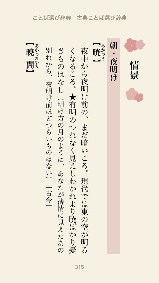 『古典ことば選び辞典』は、古典の雰囲気をうまく表現したい創作者はもちろん、日本語の美しさを堪能したい全ての人のためのスマートな古語辞典です。古典の雰囲気を出すのに使えることばを厳選し、キーワードごとにまとめて掲載しています。