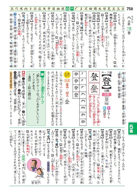 ▲『新レインボー小学漢字辞典 改訂第6版新装版』の本文【登】のページ