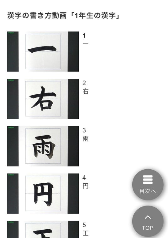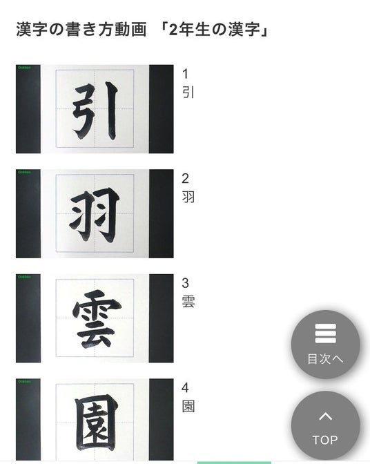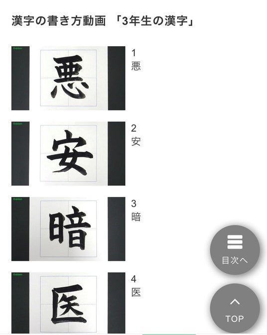書写の専門家である平形精逸先生が執筆・監修しているので、書写の授業の予習・復習ができます。動画のページでは、学年配当(その漢字を習う学年)ごとに、代表的な音読み・訓読み順に並べています。2.筆の使い方や動かし方、速さがわかる