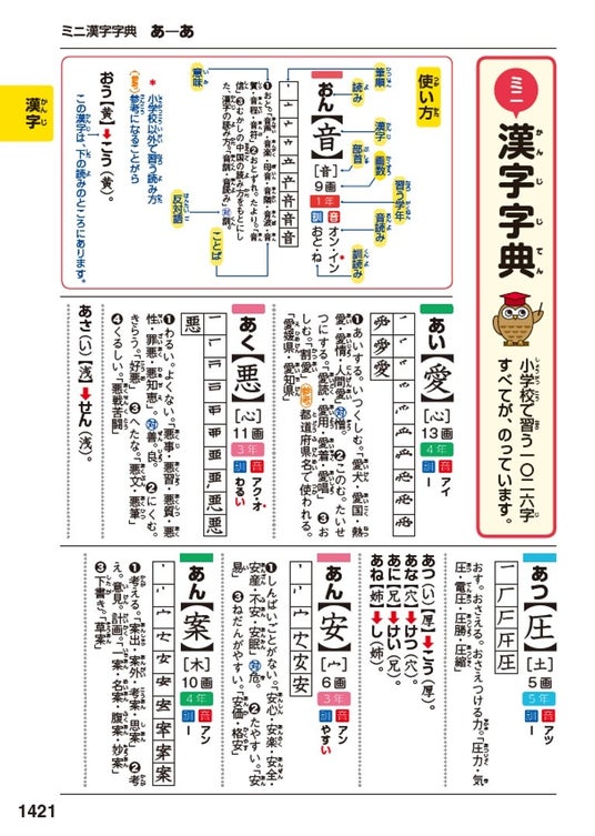 ・小学校で習う学習漢字1,026字を、代表的な音の順に並べた字典