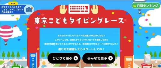 また、年間閲覧数1億PV(ページビュー)突破を記念して、これまで東京の魅力に関するワードを対象としていた人気コンテンツ「東京こどもタイピングレース」において、この出題ワードの範囲を全国に広げて募集を行いますので、奮ってご応募ください。