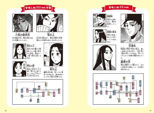 ▲登場人物が複雑な『源氏物語』。まんがで読破ジュニアでは、カラー解説でわかりやすく登場人物を紹介しています。(『まんがで読破ジュニア 源氏物語』)