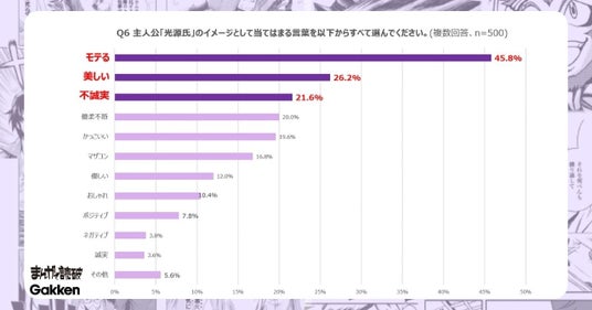 2. 「光源氏」のイメージとして当てはまる言葉を聞いたところ、1位:モテる(45.8%)、2位:美しい(26.2%)、3位:不誠実(21.6%)となった。【Q6 主人公「光源氏」のイメージとして当てはまる言葉を以下からすべて選んでください。(複数回答、n=500)】と聞いたところ、1位:モテる(45.8%)、2位:美しい(26.2%)、3位:不誠実(21.6%)となりました。「かっこいい」よりも「美しい」が上位に入り、みやびで美しいイメージが世間で受け入れられていることがわかります。