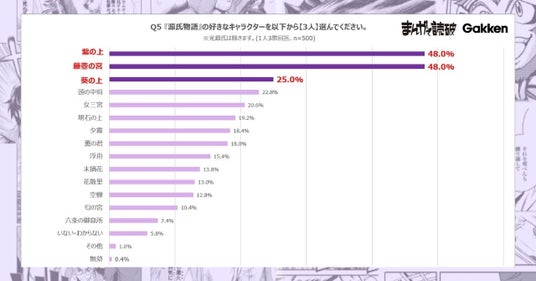 ==================================1.『源氏物語』の好きなキャラクターを聞いたところ※、1位:紫の上、同一1位:藤壺の宮、3位:葵の上となった。※複数選択、光源氏は除く。【Q5 『源氏物語』の好きなキャラクターを以下から【3人】選んでください。※光源氏は除く(1人3票回答、n=500)】と聞いたところ、1位:紫の上、同一1位:藤壺の宮(どちらも48.0%)、3位:葵の上(25.0%)となりました。続いて、4位:頭の中将(22.8%)、5位:女三宮(20.6%)となりました。