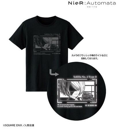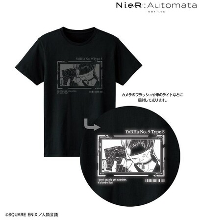 スマートフォンなどでフラッシュ撮影していただくと、2B、9Sのイラストが光って写るTシャツです。