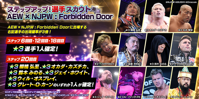 “AEW×NJPW:Forbidden Door”開催記念として、大会参戦選手がピックアップとなる各ステップアップ10連スカウトが開催!