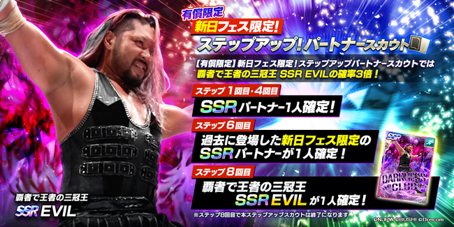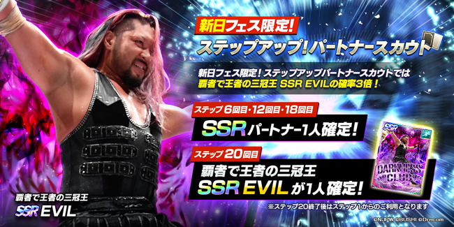 株式会社ブシロード(本社:東京都中野区、代表取締役社長:橋本義賢)は、株式会社ドリコム(本社:東京都品川区、代表取締役社長:内藤 裕紀)と共同開発しているスマートフォンゲームアプリ『新日本プロレスSTRONG SPIRITS』(以下、新日SS)にて、フェス限定新★3選手「[HOLY IRON FINGER]タイチ」と新SSRパートナー「[覇者で王者の三冠王]EVIL」が初登場する各フェス限定ステップアップスカウト開催と選手追加記念1,500ダイヤプレゼント配布を2022年6月27日(月)9:00からのメンテナンス終了後から開始した事をお知らせいたします。ぜひ貴社媒体にてお取り扱い頂きますよう何卒よろしくお願い申し上げます。