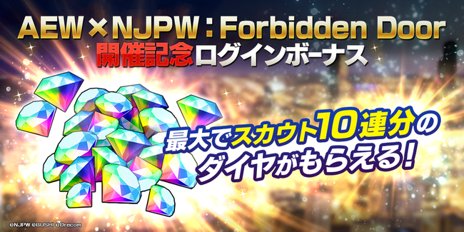 AEW× 新日本プロレス大会「AEW × NJPW : Forbidden Door」開催を記念して、期間限定で全ユーザーに1,500ダイヤ(10連スカウト1回分)を漏れなくプレゼントしています。
