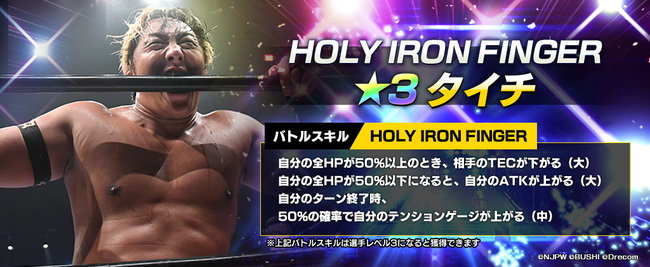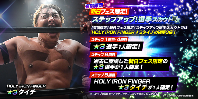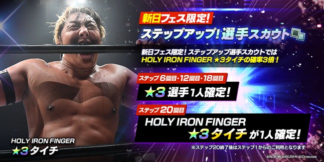 新日SSは2022年6月27日(月)9:00から実施しているメンテナンス終了後から、フェス限定新★3選手「[HOLY IRON FINGER]タイチ」が初登場するフェス限定ステップアップ選手スカウトを開催。