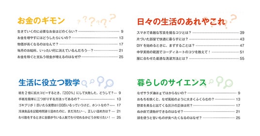 ▲目次の一部をご紹介。 だれでも持ちうる日常のちょっとした悩みやギモンが並ぶ。