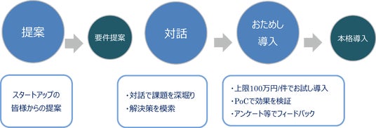 「スタートアップによる事業提案制度」は、社会課題の解決に取り組むスタートアップから、自らの技術・製品等を活用した都政に対する提案を募集した上で、各都政現場との対話により課題を深掘りし、おためし導入等を通じて提案の具体化を図る仕組みです。