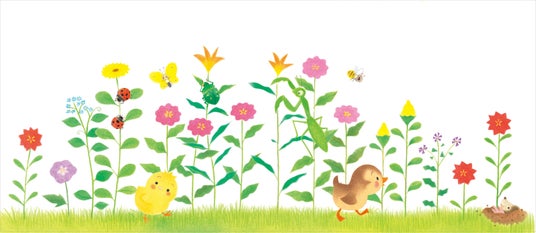 『ぴよちゃんの おともだち』中面の原画。野原を抜けてガーコちゃんのおうちへ向かいます。カマキリやテントウムシなどの細かい虫の描き込みも魅力的。