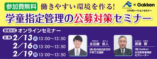 <船井総研×Gakken> 2月「学童指定管理の公募対策セミナー」/3月「保育業界向け 働き方改革の進め方セミナー」
