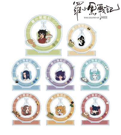 シャオヘイ、シャオヘイ(猫)、ムゲン、フーシー、シューファイ、ロジュ、シュイ、ナタの描き下ろしイラストがゆらゆら動くアクリルスタンドに仕上げました。