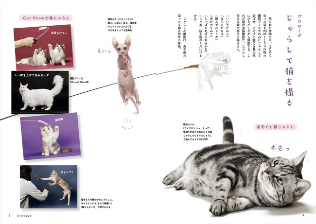 キャットショーでの撮影には毎回100種以上の猫じゃらしを持参。「どうやったら初めて会う猫ちゃんたちを思い通りに動かせるのか」いつも考えている。撮影でいろいろな犬や猫に会えるのがとっても楽しみ。福田家には現在アメリカンショートヘアとスフィンクスが3びき。